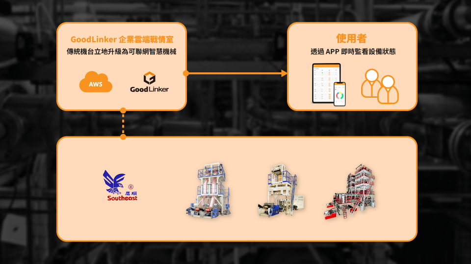 透過與 GoodLinker 合作,將設備加以監控,收機設備作動訊號並傳送雲端,使用者只要登入 APP 就能即時看到機台的狀態;傳統機械利地升級為可聯網的智慧機械。通過 AWS IoT Core 認證,並以最高規格保障資訊安全。設備警報立即透過 APP 告警,第一時間通知使用者,加速故障排除流程。