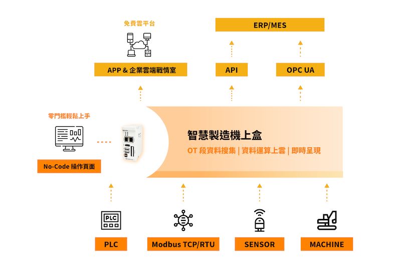 支援 GoodLinker 企業雲端戰情室及專用手機 APP,系統整合商(SI)、機電業者不需另外花時間開發、維護,安裝完智慧製造機上盒就可以立即使用!